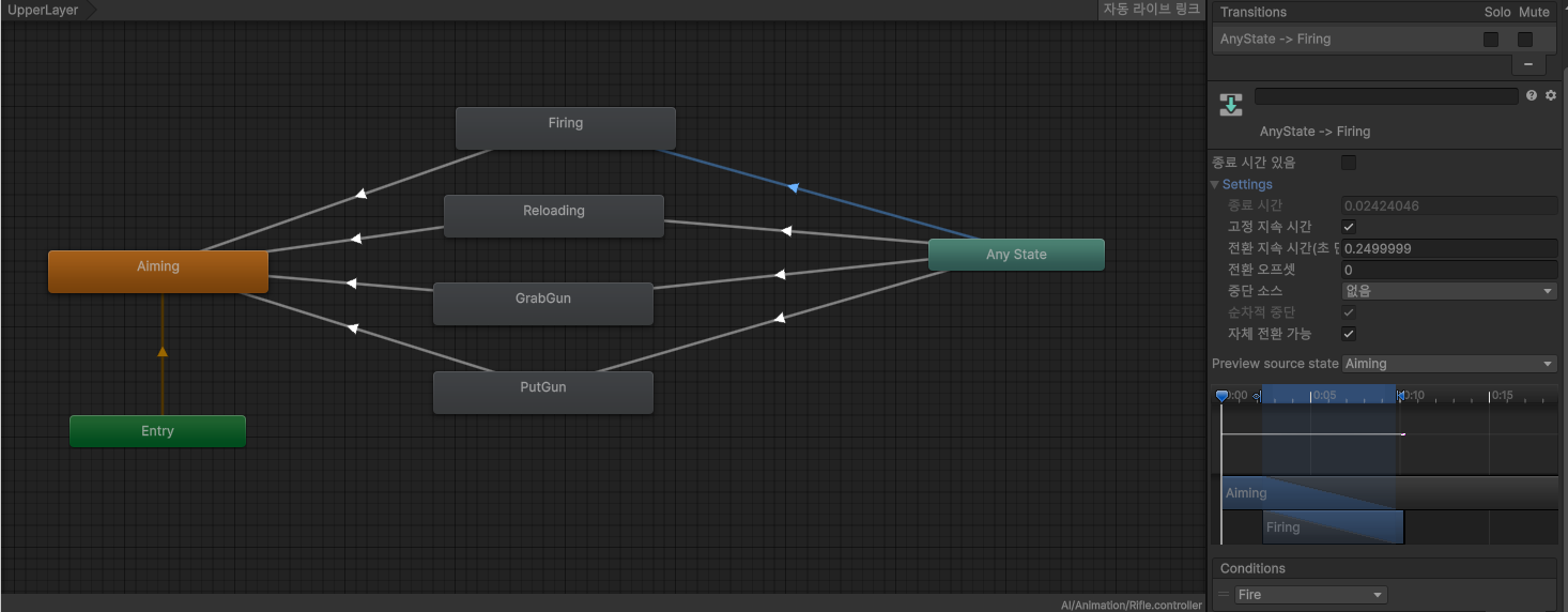 AnyState에서 실행되 애니메이션도 다시 기본 애니메이션으로 돌아가게끔 트렌지션을 만들어줘야한다.